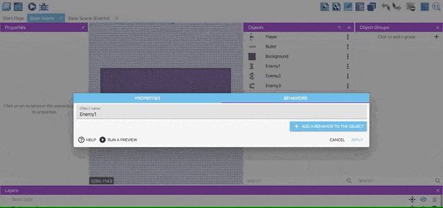 We will add three different types of enemies. Hence, you should follow the same process to add enemies. Click on Add a new object and select Sprite. Then, type "Enemy1" in the name field and select "enemy1.png" from the asset folder as an image. Click apply.