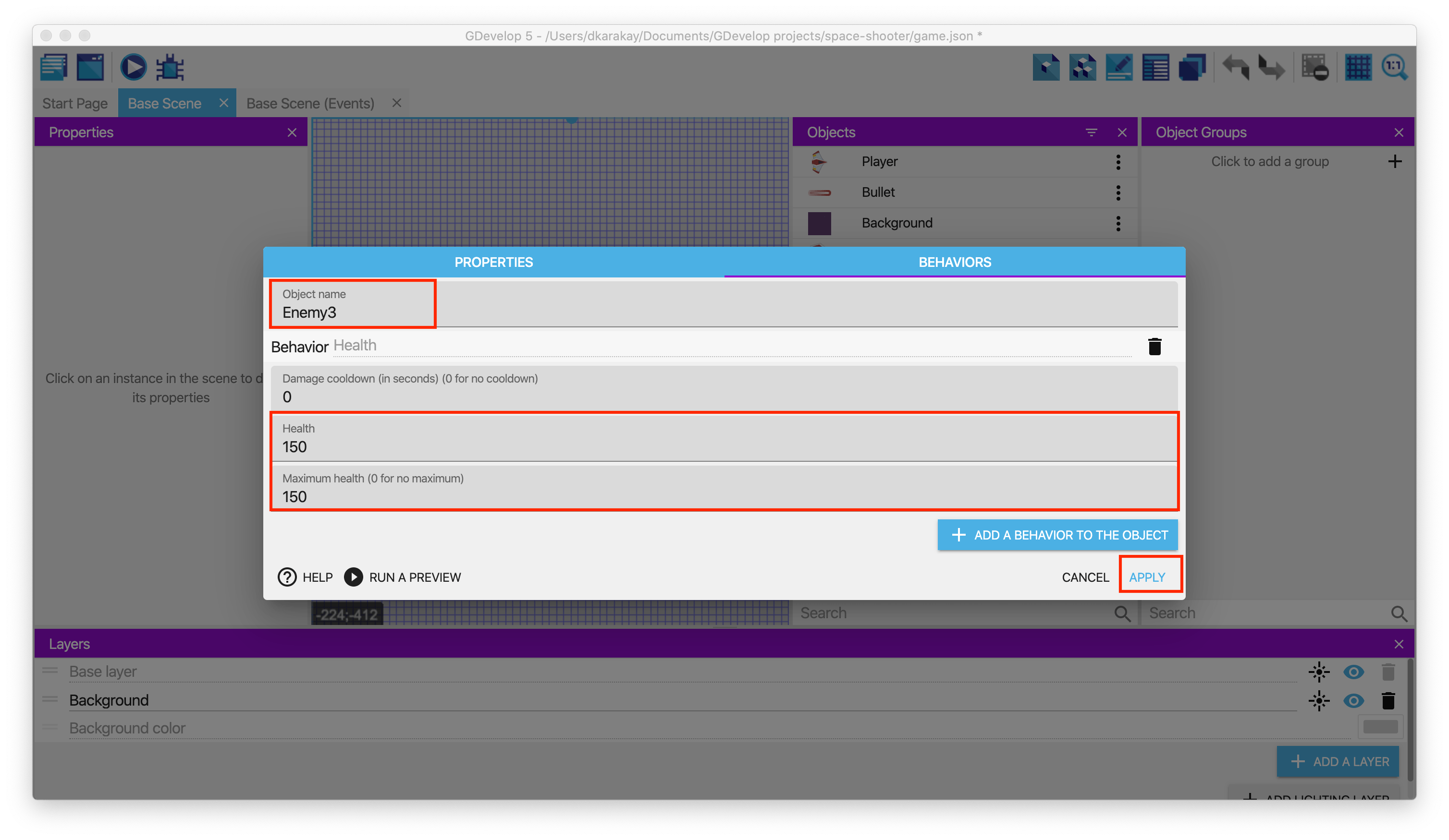 Then, open the behavior page of Enemy1 and leave it as is: Health: 100, Maximum health: 100
